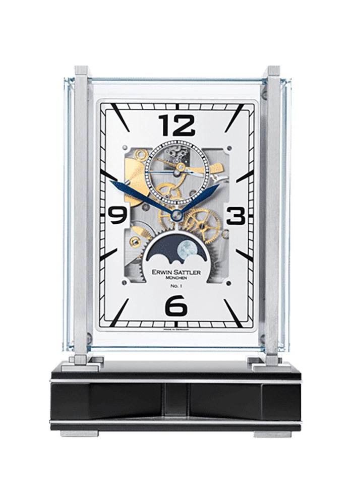 | Beschreibung | DIE NEUE TISCHUHR OPERETTA GESTATTET DURCH SECHS GLASSCHEIBEN DEN UNGEHINDERTEN BLICK IN JEDEN WINKEL IHRES INNERSTEN. Ein feiner Schlag „im Vorübergehen“, im Französischen „en passant“, also der Passageschlag, ertönt zu jeder vollen Stunde und vervollständigt, ebenso wie die handbemalte Mondscheibe diese uhrmacherische Komposition. Zum Schutz dieses besonderen Kleinods dient ein zweiteiliges Glasgehäuse, das mit Hilfe geschliffener und verchromter Messingleisten sowie einem schwarzen Schleiflack-Sockel einen würdigen Rahmen bietet und den Blick des Betrachters geschickt auf das skelettierte Zifferblatt und die skelettierte Hinterplatine lenkt. Selbstverständlich sind alle Einstellungen, von der Mondphase über die Regulierung bis hin zur Zeigerstellung, mühelos von der Rückseite zu bewerkstelligen. Ob im Büro oder im gemütlichen Zuhause, die Operetta fügt sich in jedes Ambiente geschmackvoll ein. Sie zieht die Blicke der Betrachter auf sich und erschafft so eine angenehme Atmosphäre der Entspannung. |