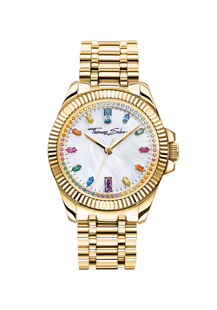 Thomas Sabo Damenuhr Divine Rainbow mit bunten Steinen gelbgoldfarben WA0395-264-207 bei Juwelier Kröpfl