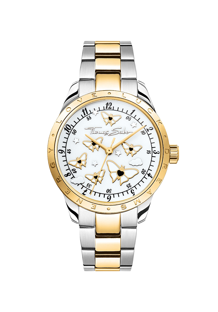 | Zifferblatt | Sonnenschliff, Weißes Zifferblatt, weiß, Schmetterlinge, gelbgoldfarbene Zeiger |